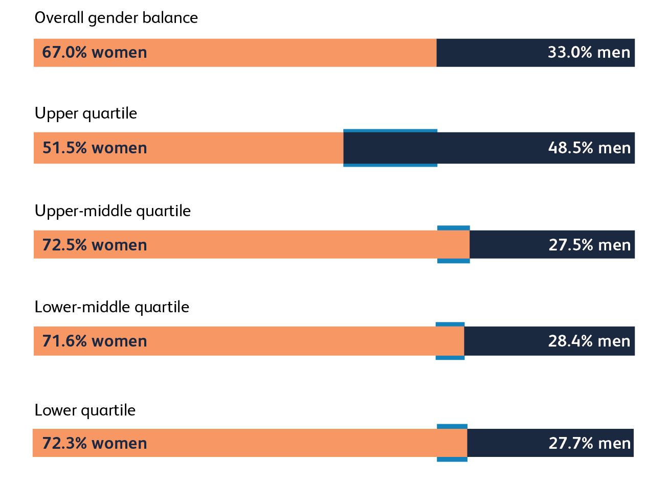 This figure shows the proportion of women and men in each pay quartile. The quartile pay bands are calculated by dividing the workforce into four equal bands ranging from the highest to the lowest hourly rate. The deviation from the distribution of staff that we would expect to see in each quartile, based on the gender split of the RCP’s workforce, is shown in light blue. These data show that women made up 72.3% of employees in our lower quartile (a decrease of 2.5% on 2024) and 71.6% of employees in the lower-middle quartile (an increase of 12.3% on 2024).